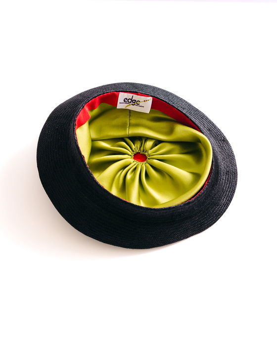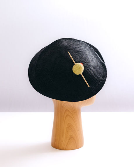 This angular parasisal beret sports an olive in place of the traditional beret topknot. The olive is actually blocked into the straw, and enhanced with merino wool roving. The inside is as lovely as the outside. While this hat already has its person, a similar hat can be created with you in mind!