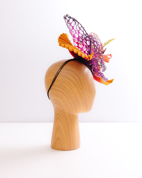 This fun piece combines two unique techniques that I learned from two of my favorite master milliners. I learned to create the colorful plastic mesh from Jenny Pfanenstiel, while studying with her in the South of France. This colorful piece is balanced with a base of Origami Silk, taught by Lina Stein. Together or separately, these two techniques offer endless possibilities!