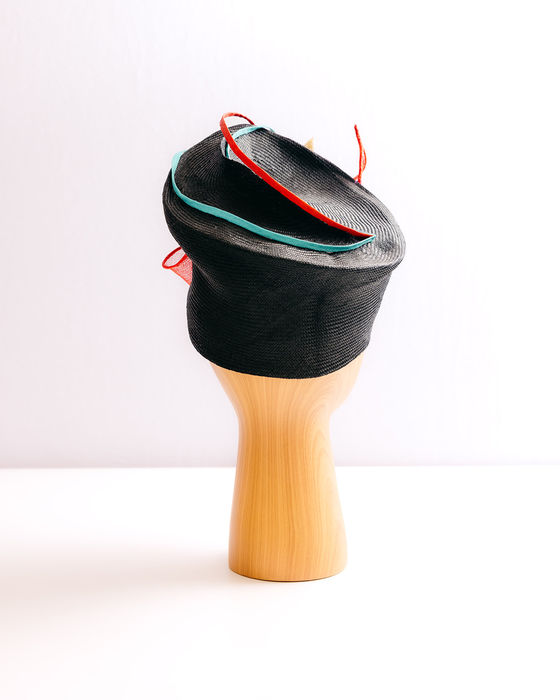 About three weeks into the lockdown during the pandemic, I had to get creative. Using supplies on hand, a black parasisal hood was blocked on an oversized, hand-carved block, then sculpted into a cross between a pillbox and a turban.