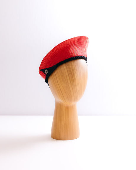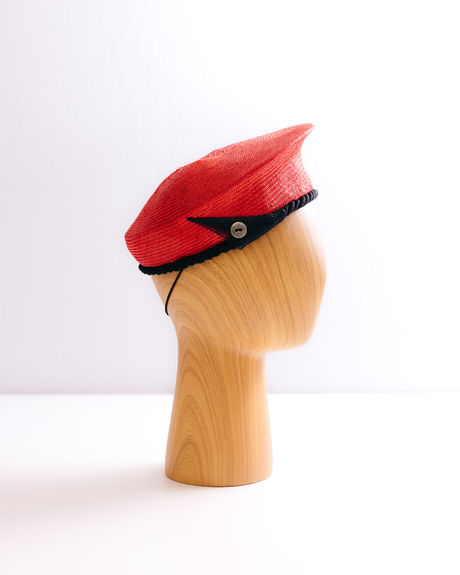 This warm-weather beret can be worn with the accent in the front or back or slanted to the left or right. This beret is blocked from red parasisal straw with black braid edging, black sinamay and a vintage button. Lightweight and cool, this hat is easy to wear, casual to dressy, day and night. Twin elastic fastening bands secure this hat in either direction.
