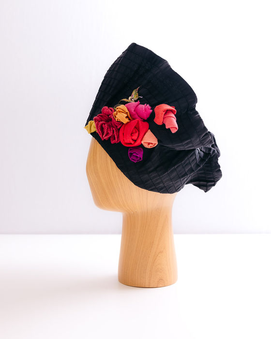 This hat marks the beginning of my Amoeba Style. Wired polyester ribbon and cotton flowers make this hat ideal for travel. It collapses for easy packing, stands up to rain and sets the mood for a Friday night dinner or other fun celebration. This hat has been and can become the inspiration for future creations.